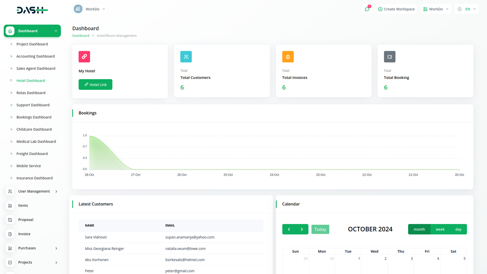 Manage every aspect of your business hotel&room management from one place. Monitor your hotel&room management, Room Booking invoice and customer from a single comprehensive dashboard.